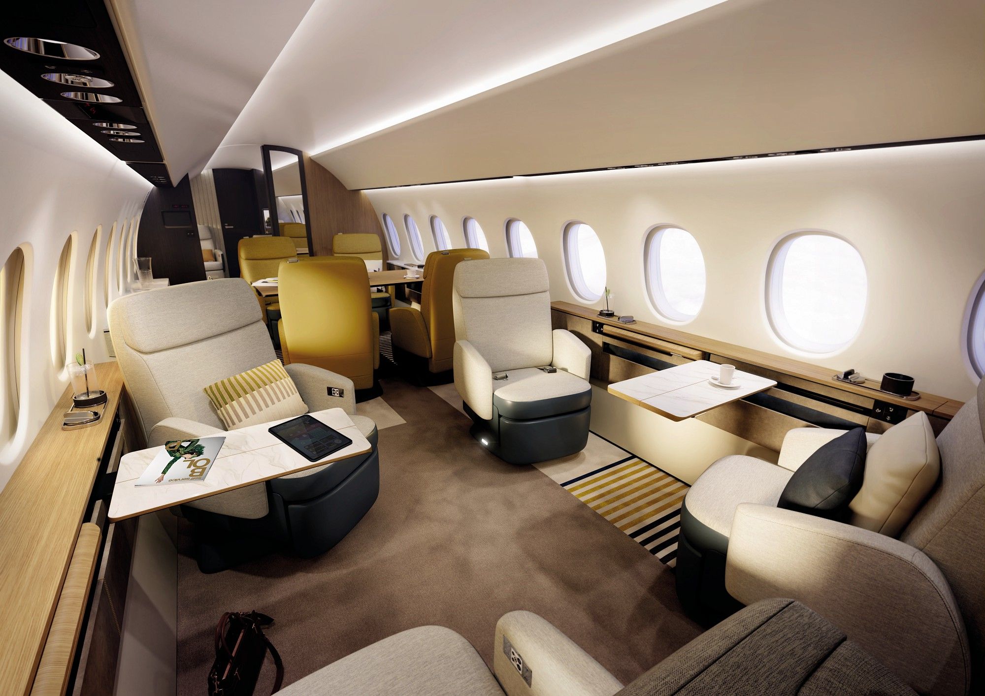 Là où le Falcon 10X se distingue véritablement, c’est sur le confort avec une cabine sans équivalent de 2,77 mètres de large, capable d’accueillir un lit deux places, une salle de bain avec cabine de douche intégrée, un espace multimédia, une grande table de travail et de réunion. Ses rivaux ne peuvent pas en dire autant. Et quand on évolue dans ces gammes de prix, Rappelons-nous du beau slogan inventé par Renault : « le vrai luxe, c’est l’espace ».