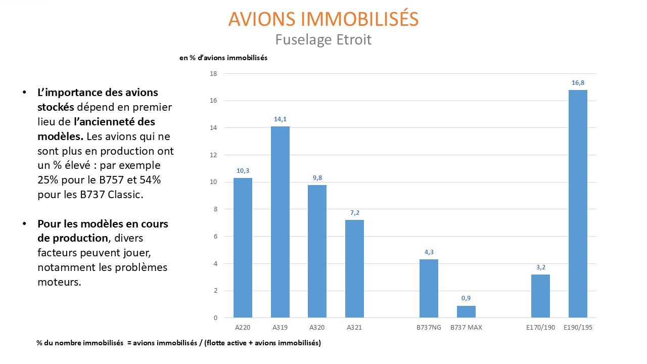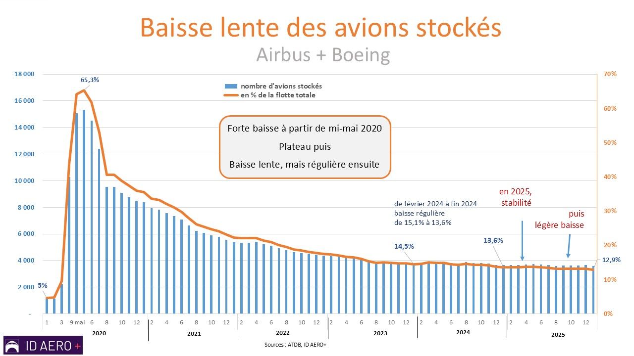 La faiblesse des retraits en 2021-2025 a pour corollaire un haut niveau des avions qui demeurent immobilisés. Les appareils qui n’ont pas été retirés ne sont pas en activité, ils demeurent dans le stock des appareils immobilisés.