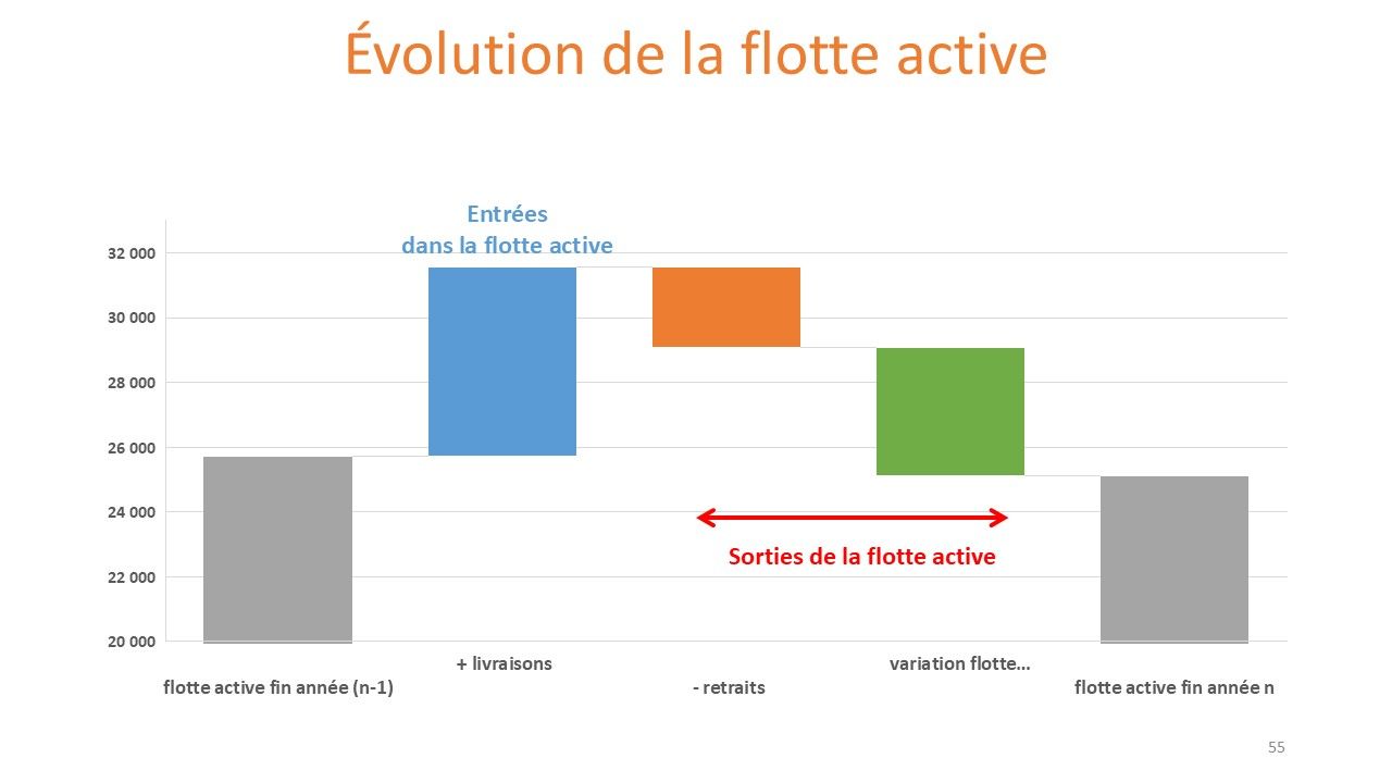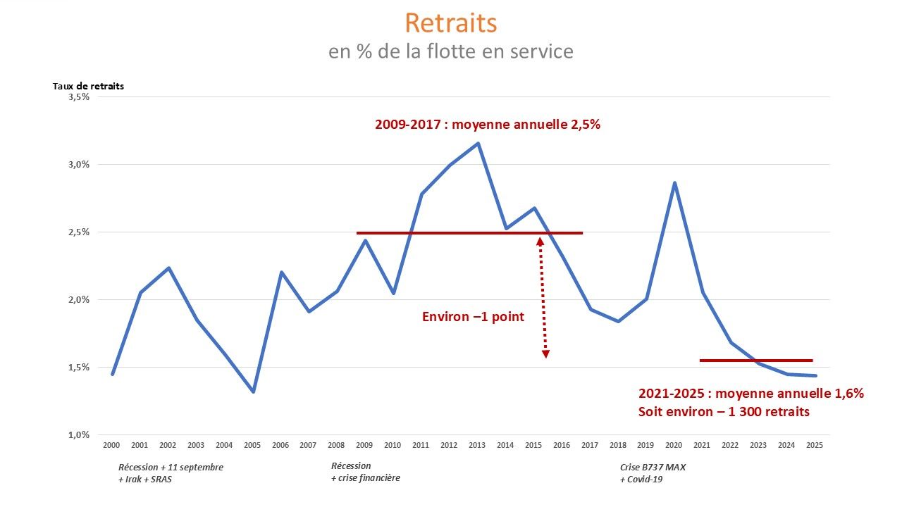 Au cours de la décennie 2010 (2010-2019) le taux de retraits a été en moyenne annuelle de 2,3% de la flotte.