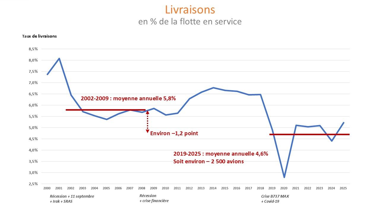 Taux de livraisons = livraisons des avions de ligne à réaction (année n) / flotte en service (fin année n-1)