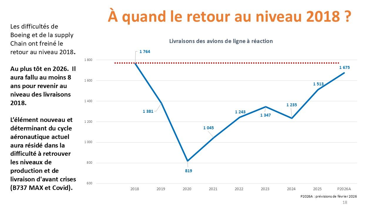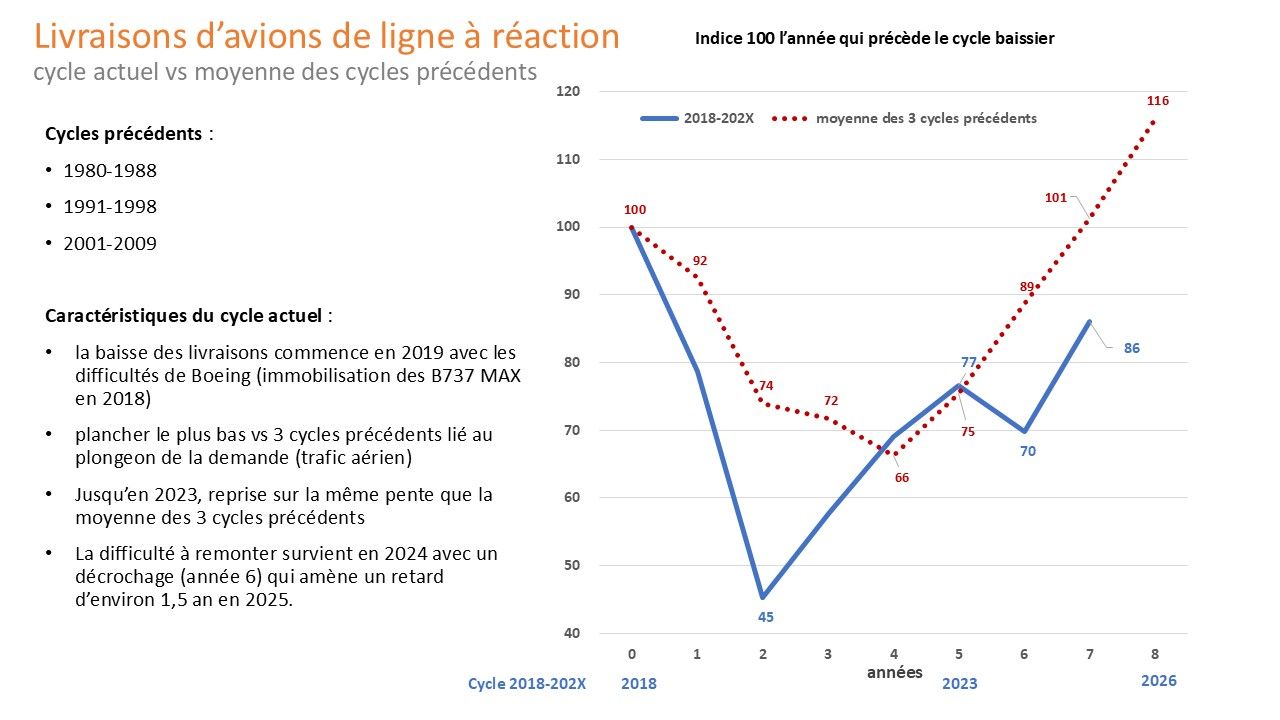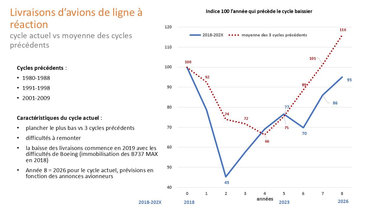 L’élément nouveau et déterminant du cycle aéronautique actuel (2018-202X) réside dans la difficulté à retrouver les niveaux de production et de livraison d'avant crises (B737 Max + Covid)
