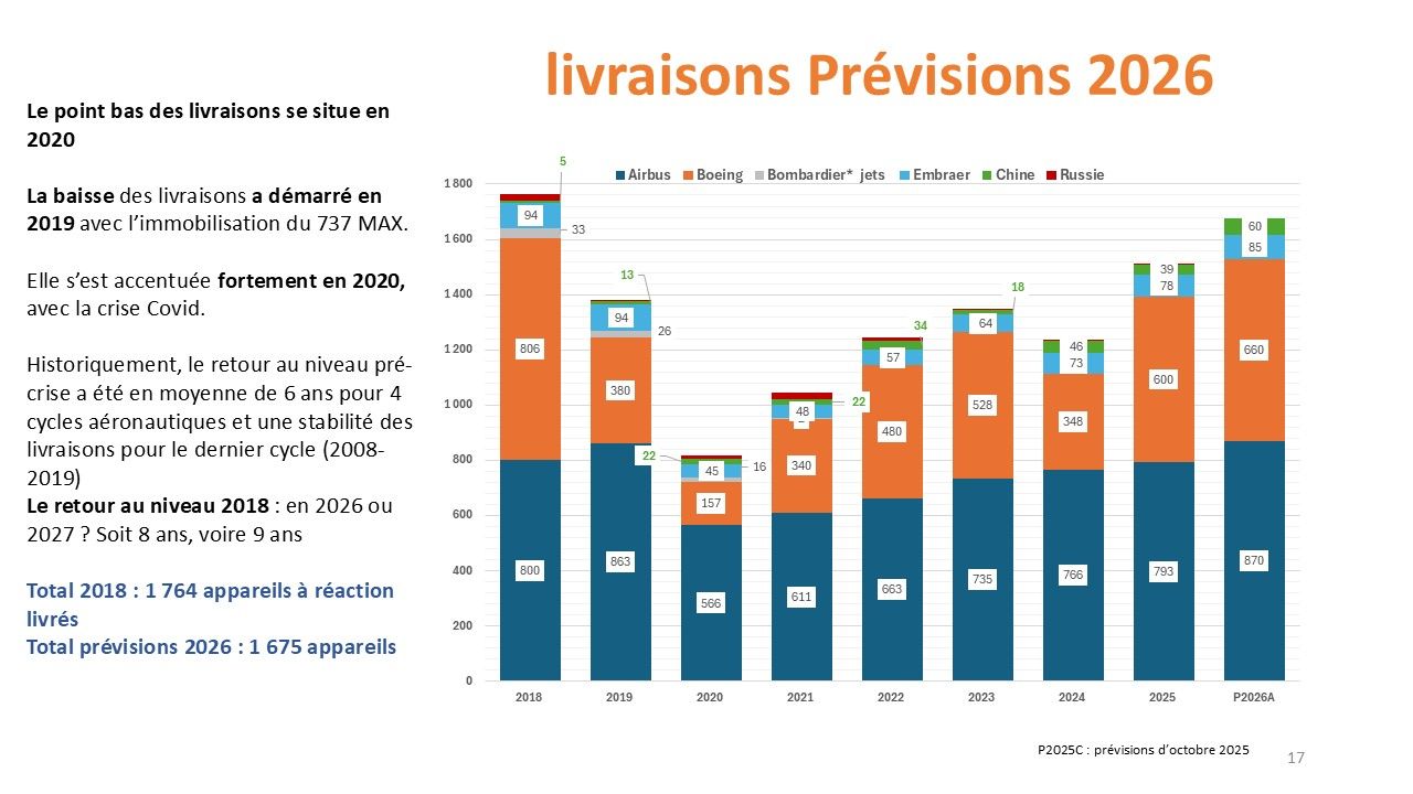 Au vu des livraisons des premiers mois de l’année, la prévision de 1 675 appareils à réaction livrés en 2026 apparait être l’objectif maximum que les avionneurs pourront atteindre.