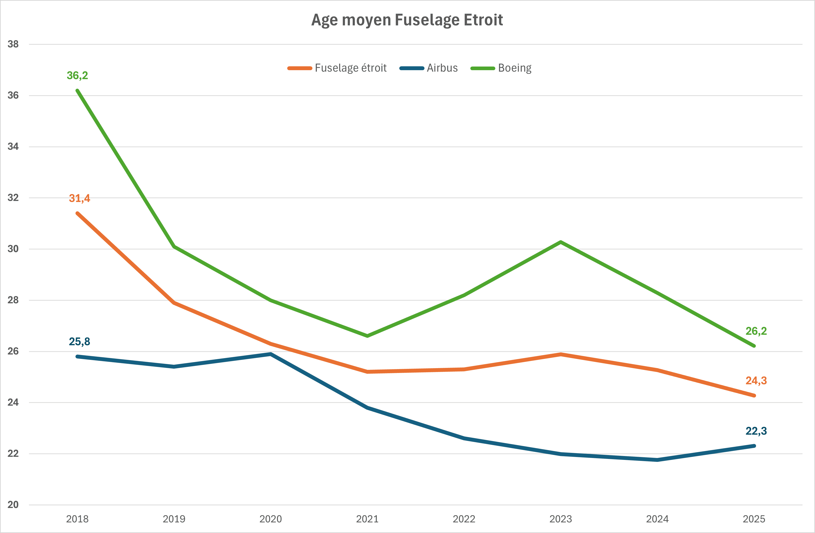 Ce résultat est confirmé par l’évolution depuis 2018. : Boeing “vide” progressivement un stock d’appareils très âgés et/ou des types très anciens encore présents, pendant qu’Airbus est déjà “normalisé” sur un âge de retrait plus jeune.