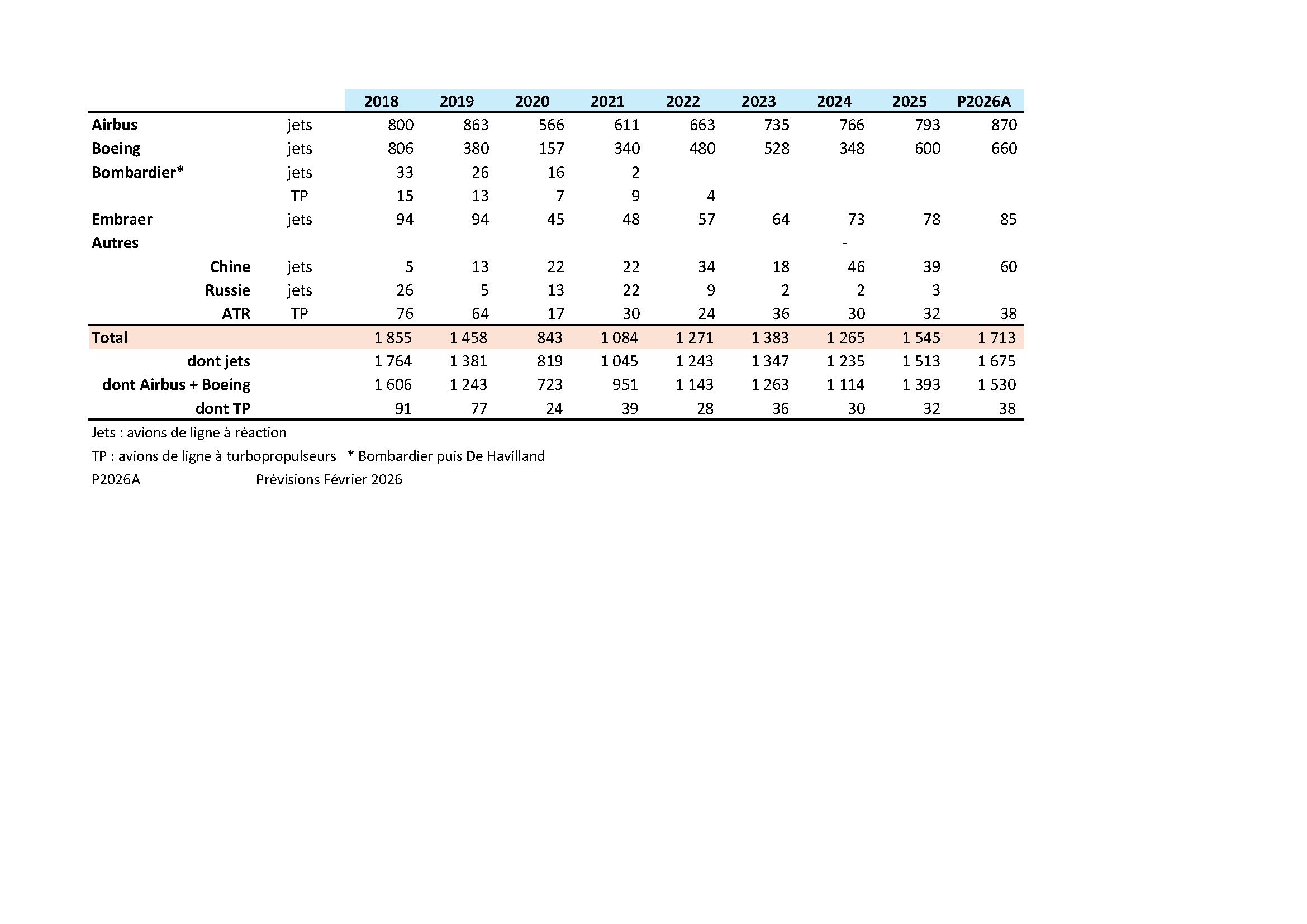 Les prévisions 2026 sont basées sur les déclarations et prévisions des avionneurs.